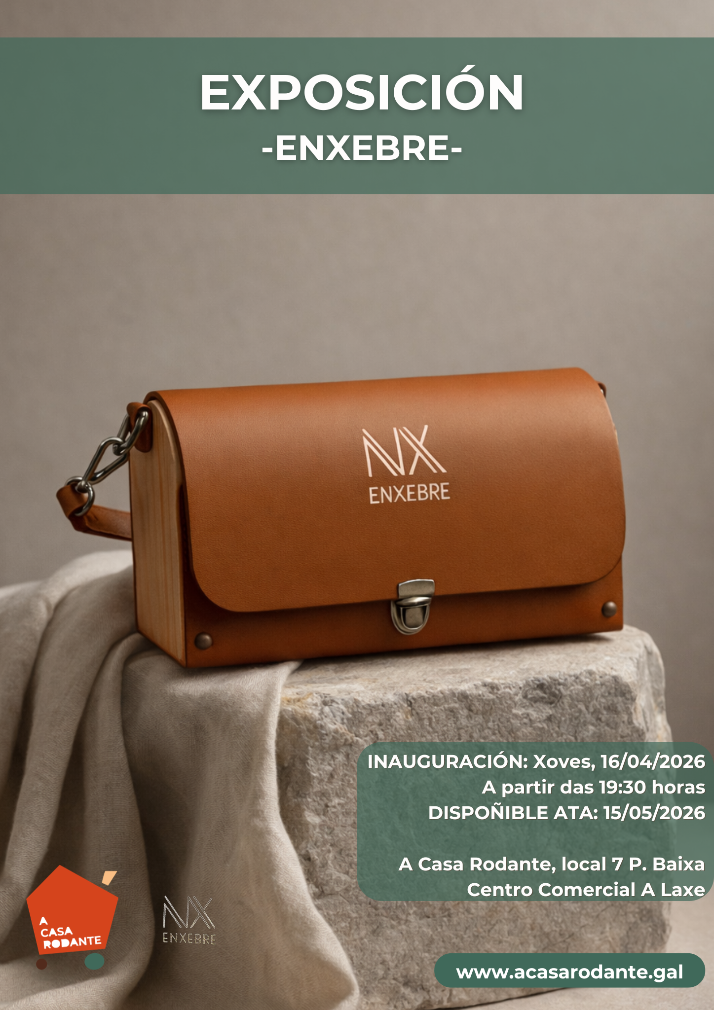 Chega ao noso Espazo Rodante a exposición de pezas de marroquinería de Lara Freire, baixo a súa marca «Enxebre«. A partir do xoves, 16/04/2026, no local 7 da planta baixa, do