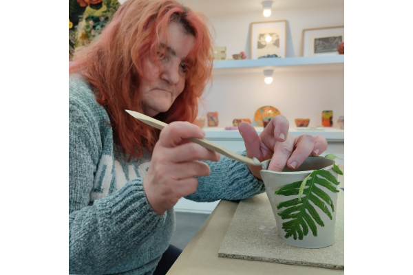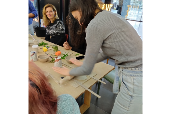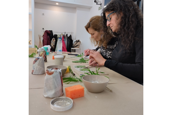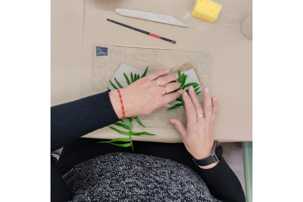 Durante a sesión, as asistentes puidemos familiarizarse con algúns dos conceptos básicos destra disciplina artesá. Aprendemos a estampar vexetais sobre o material, modelamos un pequeno vaso e pintámolo, cada unha ao noso gusto. Tamén nos ensinou algún que outro truco, que por suposto non imos desvelar!