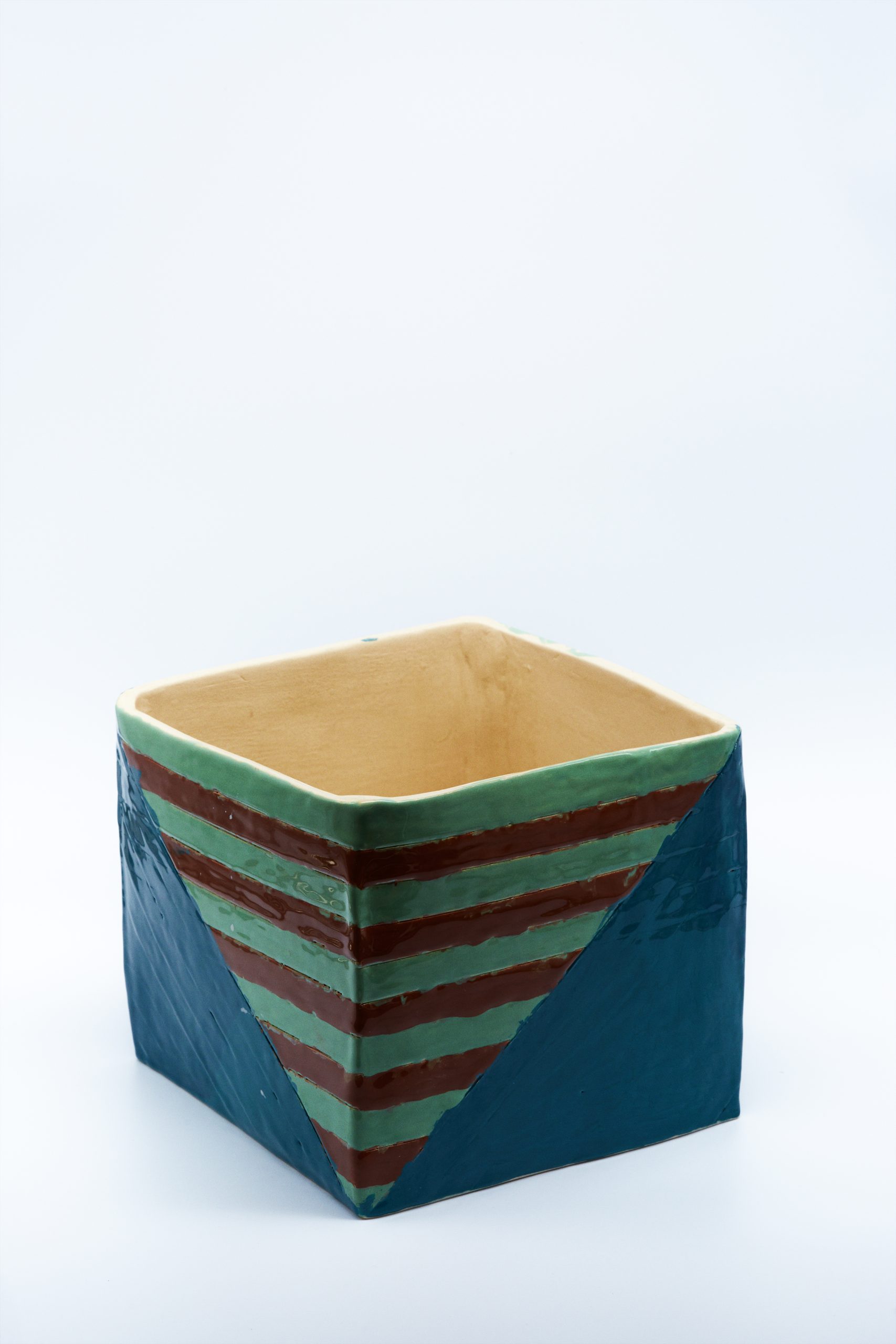 Maceta de cerámica feita a man, con base cadrada e pintada a raias.